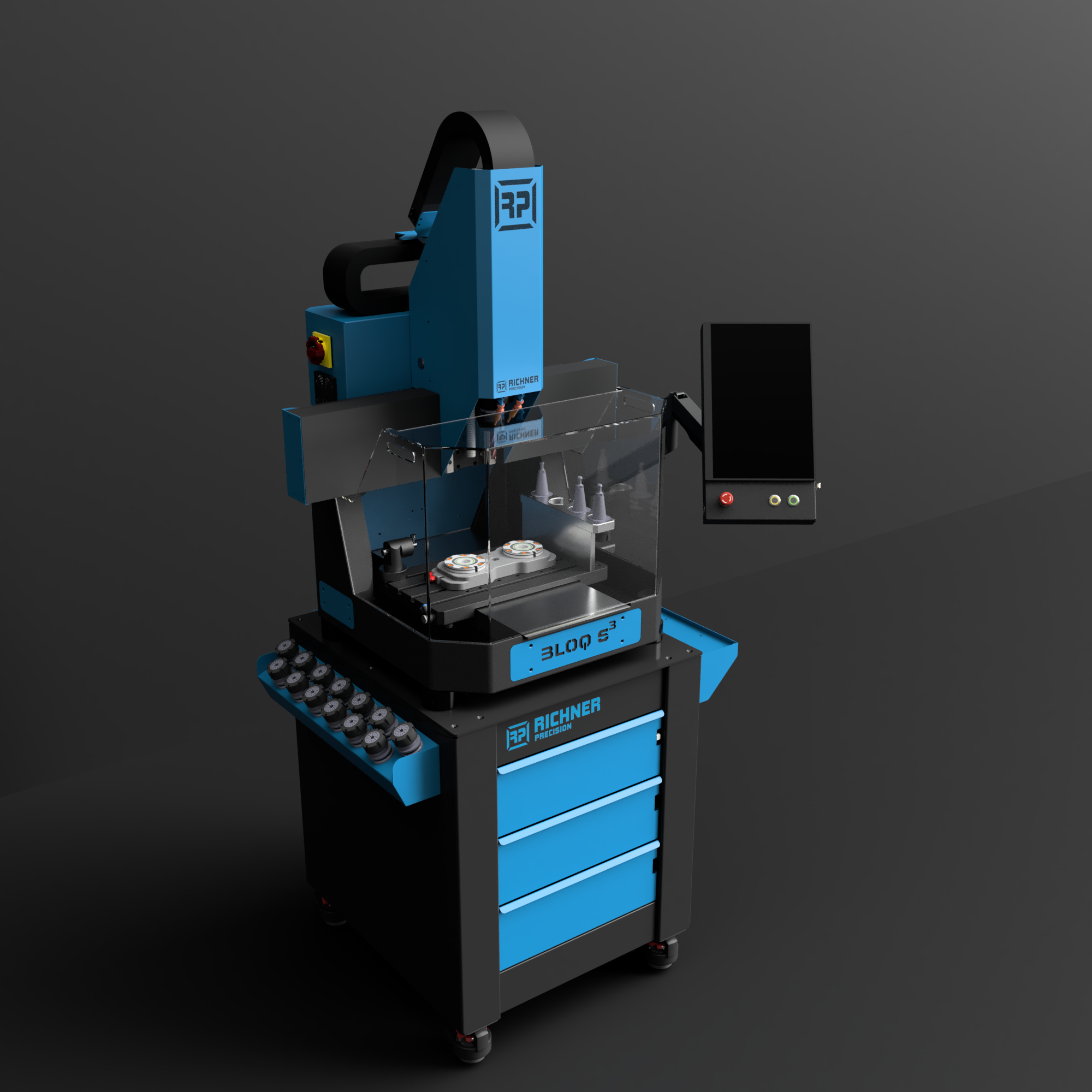 Mit einem Verfahrweg von 450 × 280 × 270 mm, einem 440 × 260 mm grossen Tisch mit vier 8 mm T-Nuten und einer Steifigkeit, die weit über ihre Grösse hinausgeht, ist die BLOQ6 bereit für Hochleistung auf kleinstem Raum.